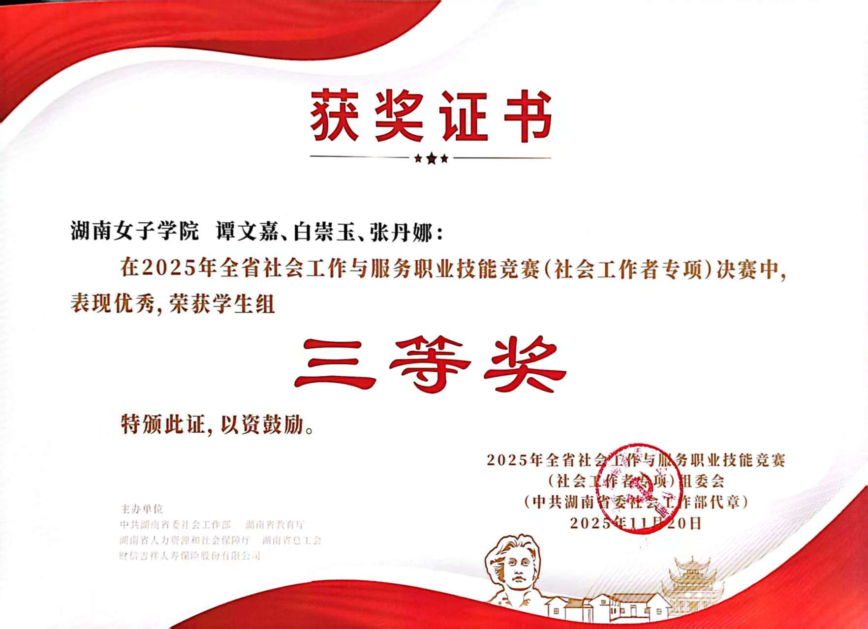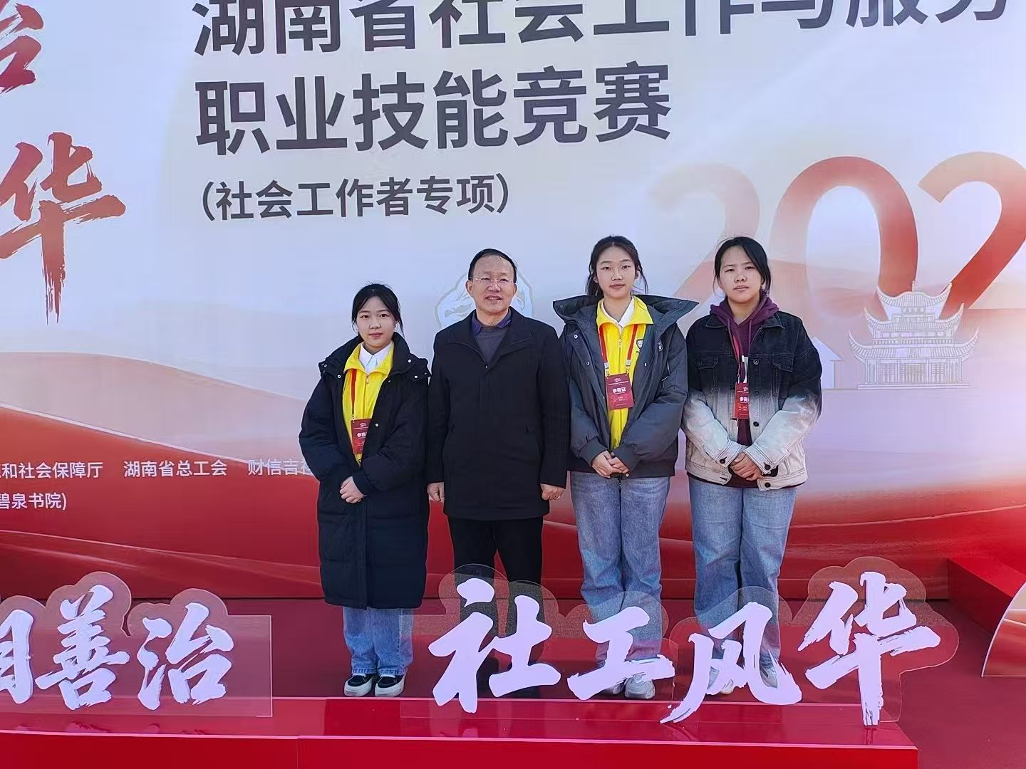 本网讯(社会发展学院 欧阳小鹃 白崇玉)11月17日-20日,由中共湖南省委社会工作部、湖南省教育厅、湖南省人力资源和社会保障厅、湖南省总工会、财信吉祥人寿保险股份有限公司共同主办的第一届湖南省社会工作与服务职业技能竞赛在湘潭大学举行。来自全省包括中南大学、湖南师范大学、湘潭大学、湖南工商大学、中共湖南省委党校在内的多所高校的24支研究生、本科及专科队伍同台竞技。湖南女子学院社会发展学院“知行合益队”凭借出色发挥,荣获大赛三等奖,充分展现了我院社会工作专业的教学成果和学生的专业素养。