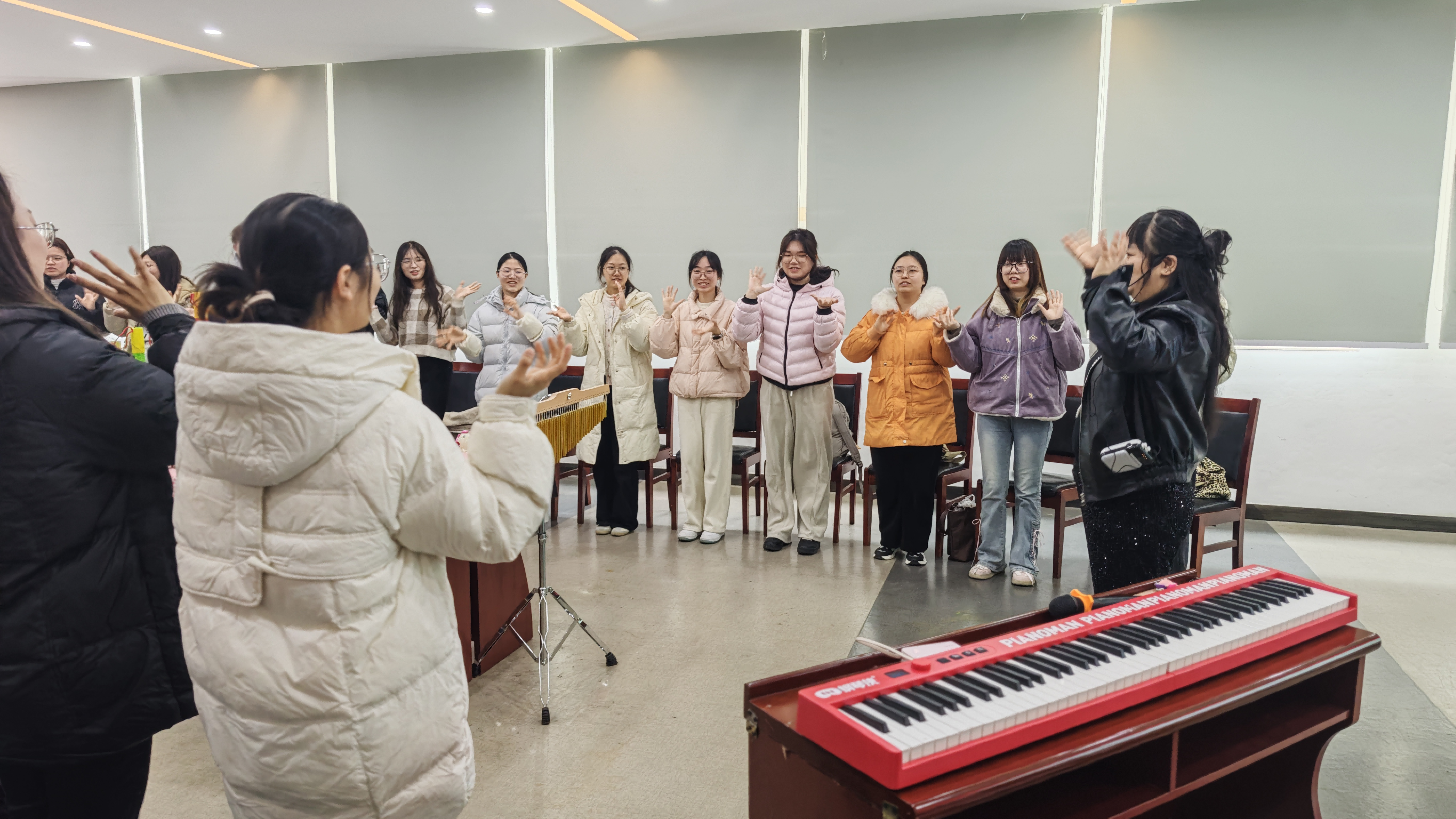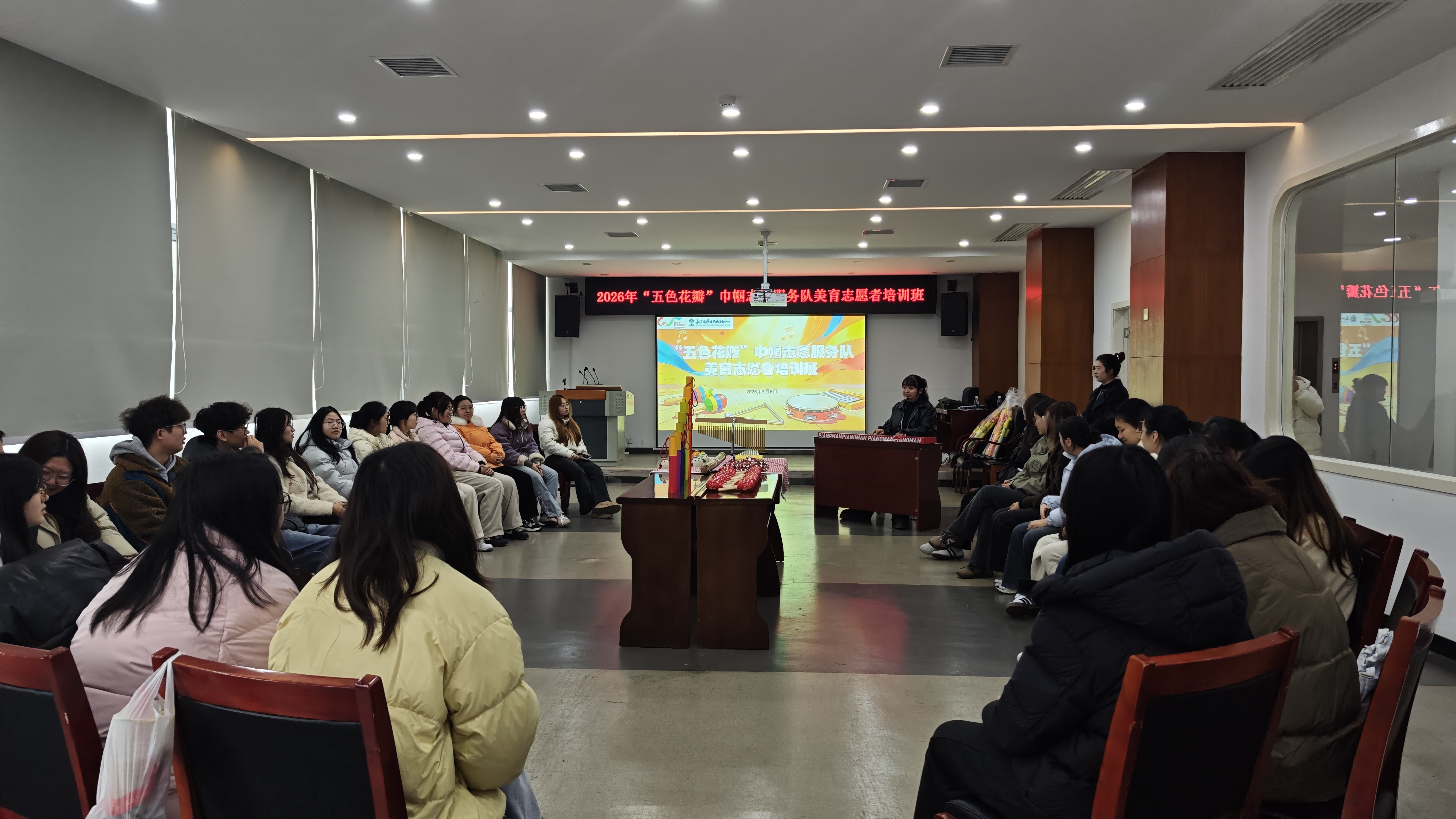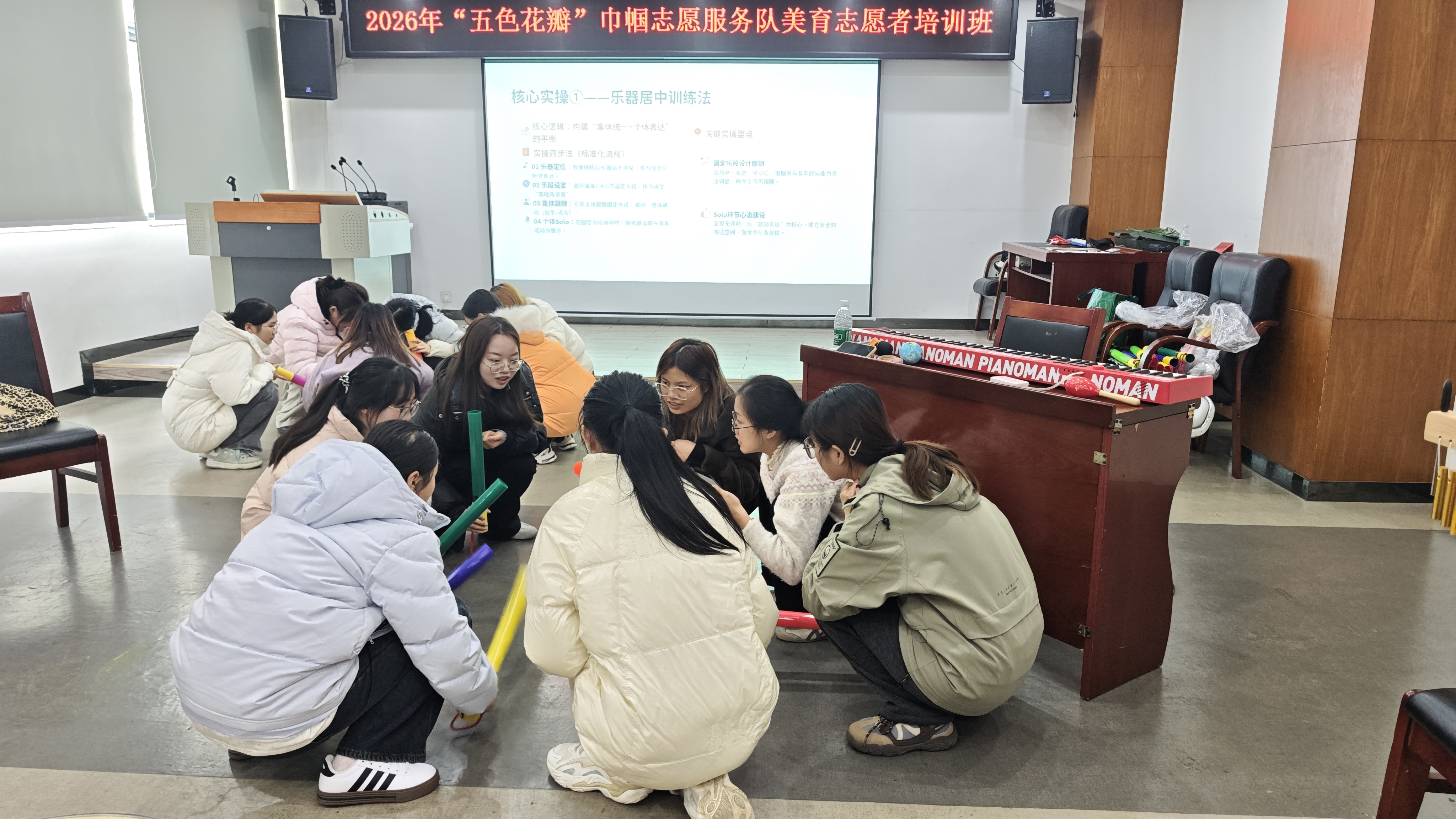 作为深耕妇女儿童事业的高校学子,两个专业学生展现出高度专业热情。培训聚焦“奥尔夫音乐疗愈”主题,融合美育与心理健康教育,讲师通过互动演示,引导志愿者领悟其“诉诸感性、回归人本”的核心。学子们积极参与节奏拍打、身体律动等互动,在实践中掌握身心协调、情绪调节的基本方法,深刻体会艺术在亲子沟通、家庭情绪调节中的疗愈价值,契合学前教育专业育儿实践与女性学专业服务妇女儿童的核心需求。